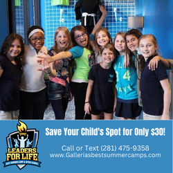 Are you looking for a fun and safe place for your child to spend the summer? Galleria’s Best Summer Camps at Leaders for Life Martial Arts is the place for you! Your child will practice soccer, basketball, baseball, dance, martial arts, watch movies, have educational lessons, and make arts & crafts! The fun doesn’t stop there! We’ll have relay races, weekly field trips (that are optional), and more! All your child needs to do is come in comfortable clothing and bring a sack lunch. Limited space available! Call or Text (281) 475-9358 or visit us at www.galleriasbestsummercamps.