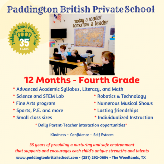 Paddington is a privately owned school and has been enriching the lives of children since 1989. We serve children from 12 months to 4th grade. Paddington's unique, child-appealing campus and our advanced academic curriculum were created with aspects from the British system and are enhanced by our exceptional Fine Arts program which supports the growth of the whole child by developing both the artistic and academic side of the brain.